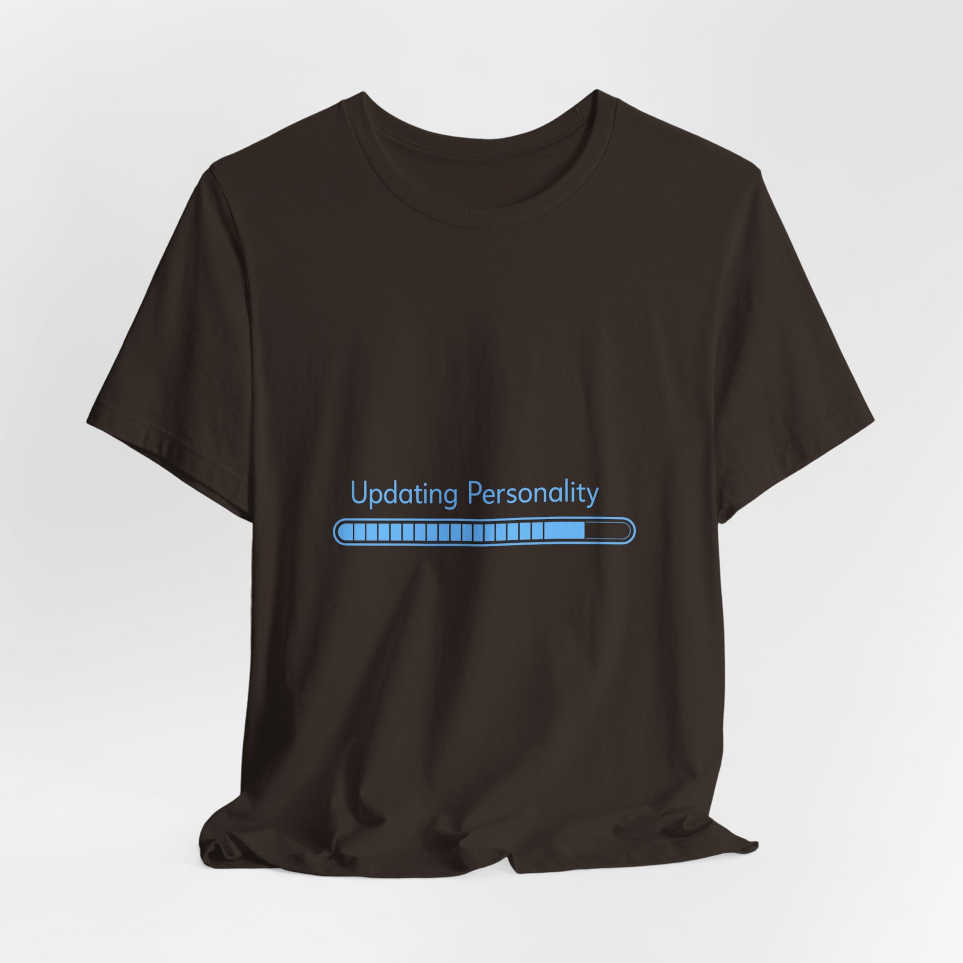 This lightweight crew-neck tee carries a sly, techy wink — a soft bar and the phrase “Updating Personality” sit centered across the chest in cool blue tones. It feels like slipping on a familiar joke: relaxed, low-profile, and quietly clever. The breathable Airlume cotton keeps you comfortable all day, while the retail fit and ribbed collar give a neat silhouette that layers easily under jackets or stands on its own. Wear it when you want to signal playful self-awareness — at coffee runs, coding sessions, or casual meetups where humor meets honesty.